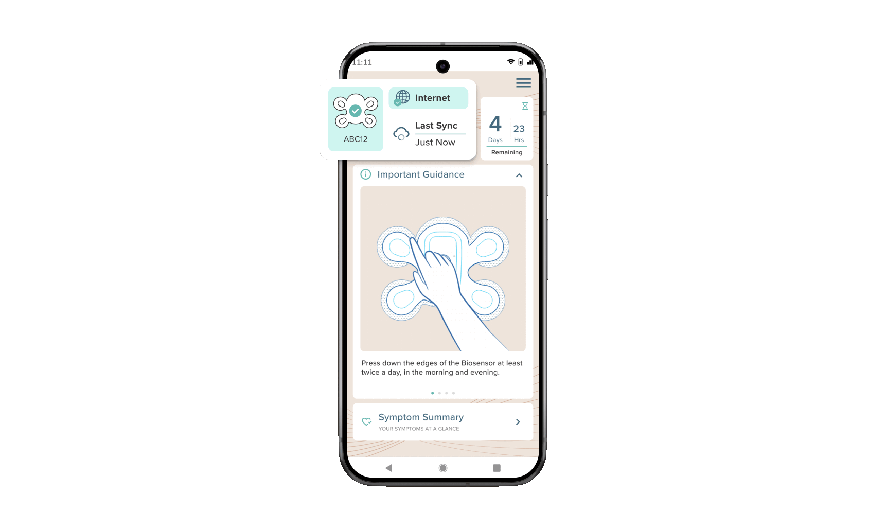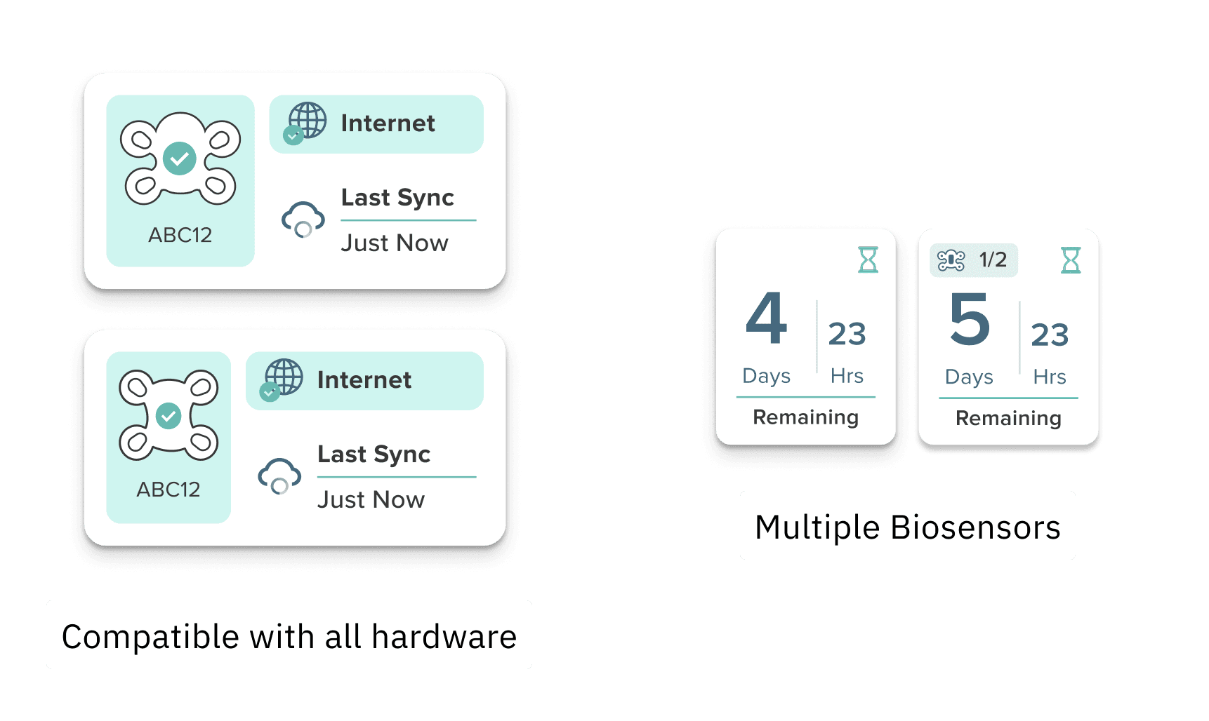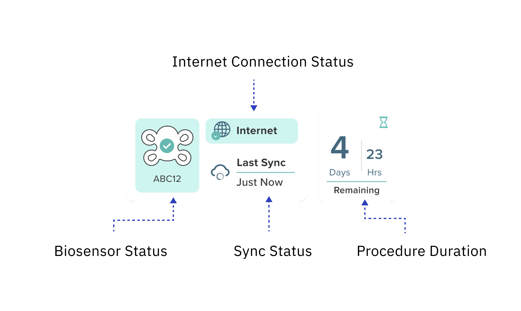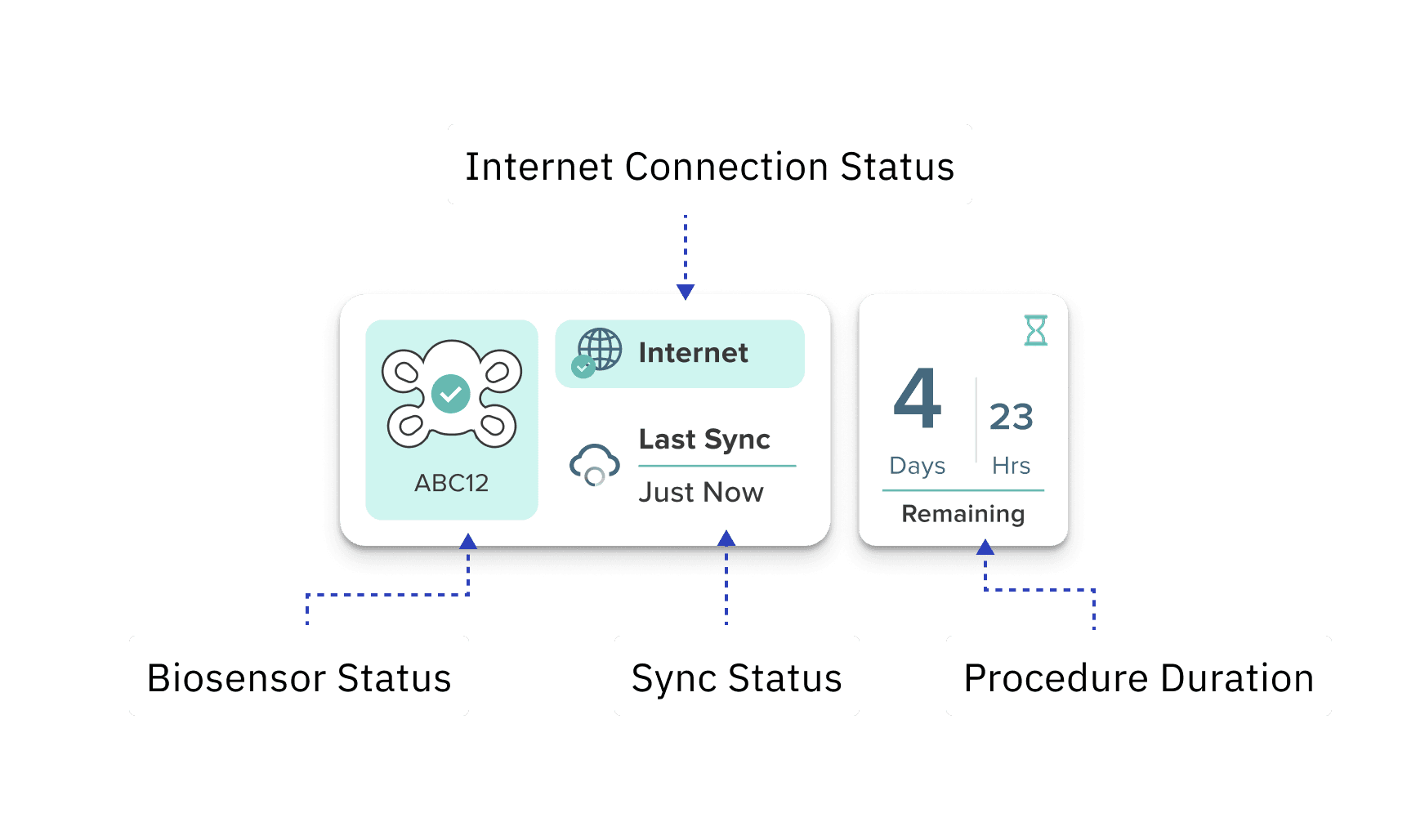 Designed a clear dashboard that shows biosensor connection, internet status, and data sync at a glance. A progress tracker and quick-access guide help patients monitor tests and troubleshoot on their own.