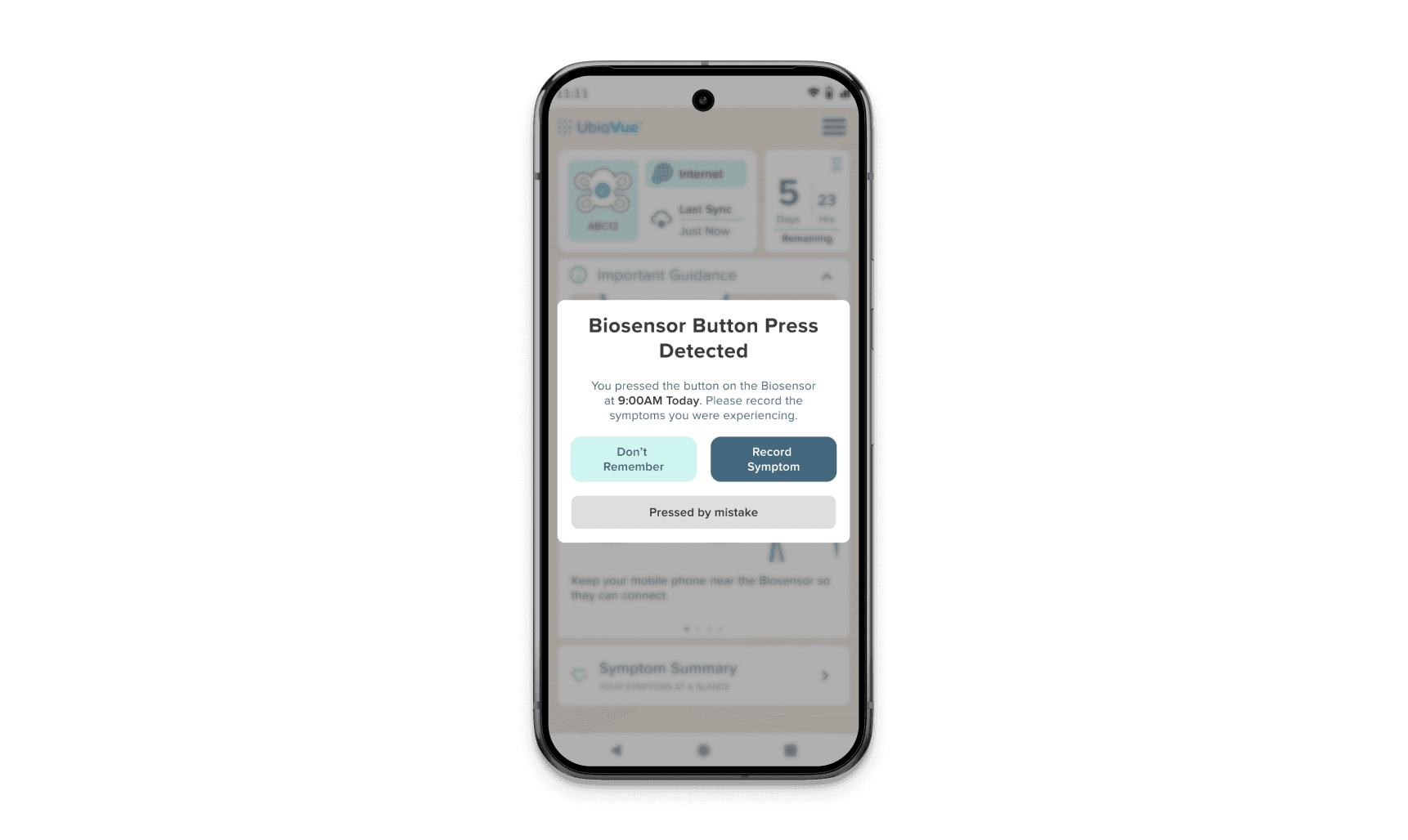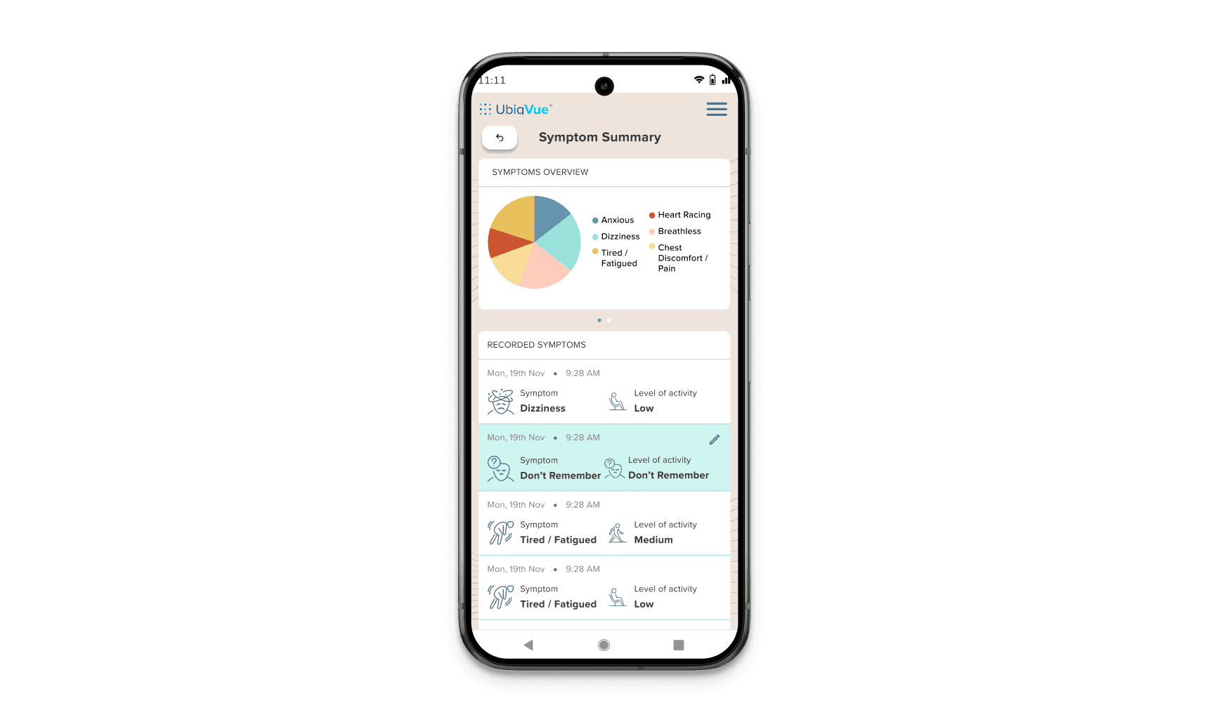 Each entry is time-stamped, synced with ECG data, and summarized clearly for both patients and clinicians.